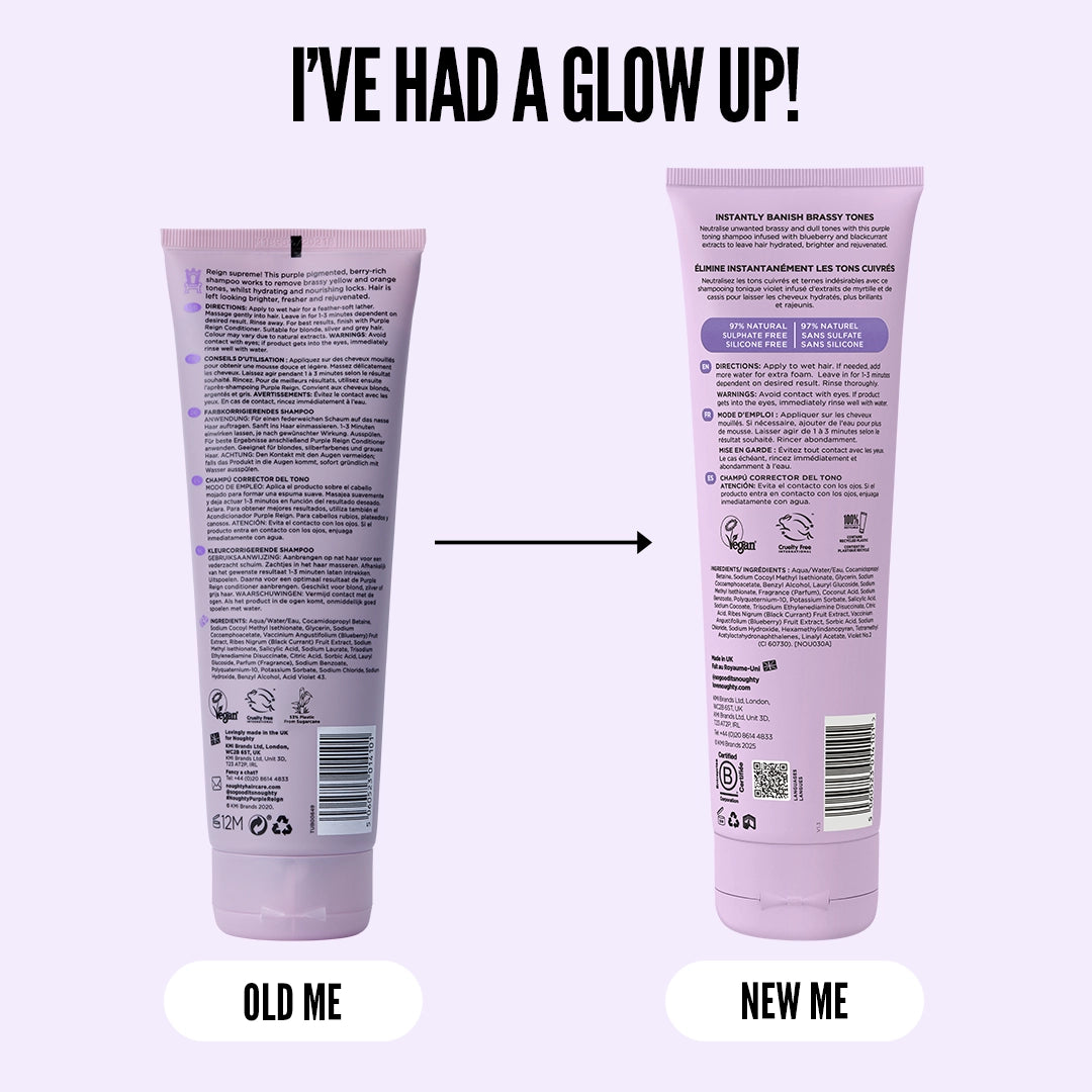 Besiegen Sie Messingtöne mit dem farbkorrigierenden Purple Reign Shampoo. Neutralisieren Sie unerwünschte Töne für helleres Blond, lebendigeres Silber und frischeres Grau. Natürlich, sulfatfrei, silikonfrei, parabenfrei. Vegan und frei von Tierversuchen