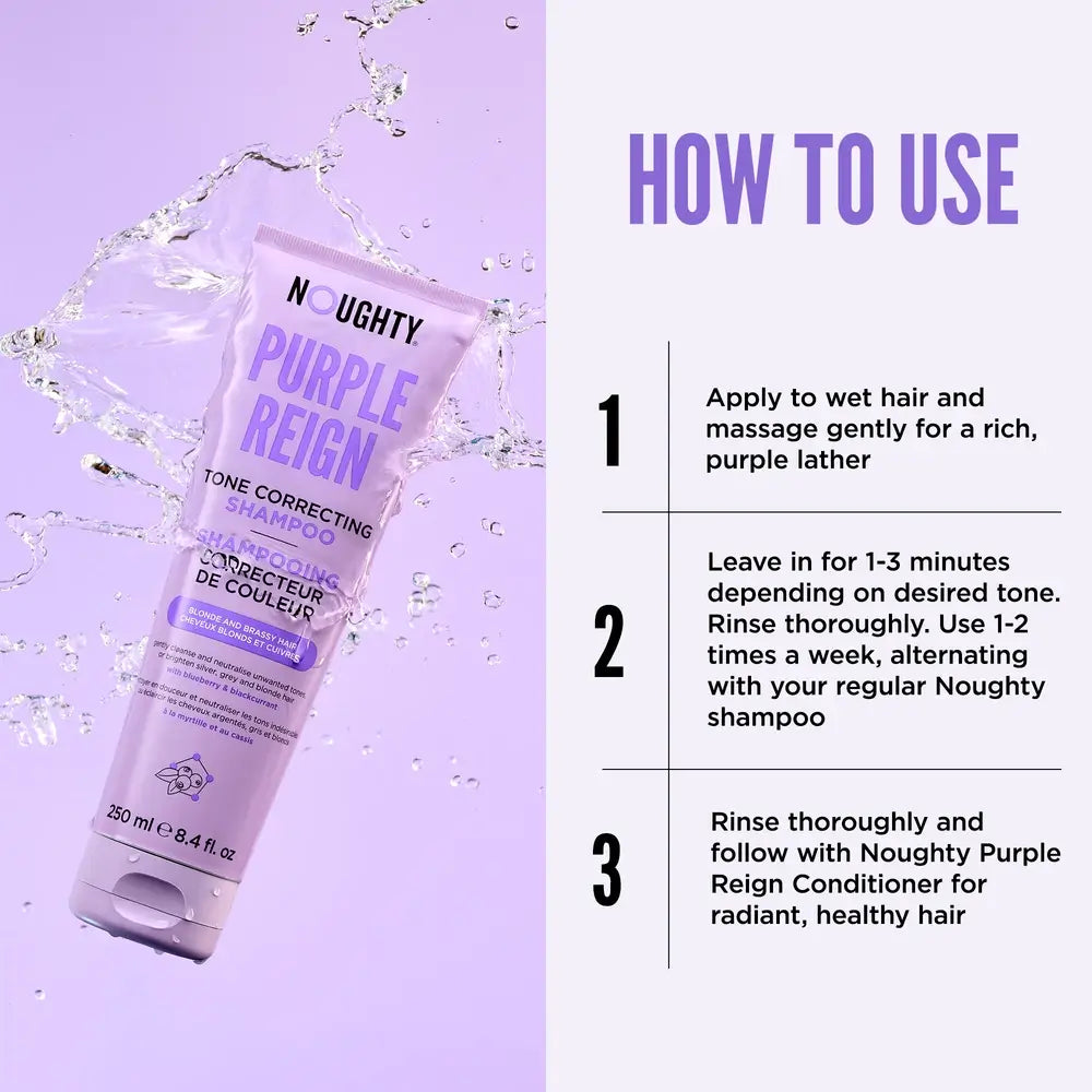 Purple Reign Shampoo, ein sanftes farbkorrigierendes Shampoo, angereichert mit feuchtigkeitsspendenden Extrakten, die reich an Antioxidantien aus Blaubeeren und schwarzer Johannisbeere sind. Purple Reign Shampoo ist eine perfekte Mischung aus grüner Chemie und Natur. Formuliert ohne Sulfate (Natriumlaurylsulfat (SLS), Natriumlaurethsulfat (SLES)), die regelmäßig in herkömmlichen Haarpflegeprodukten verwendet werden. SLS und SLES sind dafür bekannt, dass sie austrocknen und die Kopfhaut reizen, insbesondere bei empfindlichem natürlichem Blond oder farbbehandeltem Haar. Stattdessen wird die Leistung unserer Shampoos durch eine innovative Mischung aus pflanzlichen Reinigungsmitteln (Tensiden) angetrieben, die aus Kokosnüssen* gewonnen werden, wie Cocamidopropyl Betain, Natriumcocoyl Methylisethionat, Natriumlaurylsarkosinat. Diese milden und sanften Reinigungsmittel sind schonend für natürlich blondes oder farbbehandeltes Haar, aber dennoch kraftvoll genug, um überschüssiges Öl und Schmutz anzuziehen und gleichzeitig messingfarbene und gelbe Töne zu neutralisieren. *Die Quelle kann von Zeit zu Zeit geändert werden, um natürliche Ressourcen zu schützen.Wie funktioniert ein violettes Shampoo? Es ist ein Balanceakt zwischen zwei Arten von Chemie, Tensid- und Farbchemie. Der Hauptzweck eines Tensids besteht darin, zu reinigen, und während wir Purple Regin Shampoo zum Reinigen benötigen, müssen wir es auch verwenden, um messingfarbene und gelbe Haartöne zu neutralisieren. Tensidmoleküle haben zwei Enden: eines, das von Wasser angezogen wird (hydrophil), und eines, das von Öl und Fett angezogen wird (lipophil oder hydrophob).Wenn Shampoo auf nasses Haar aufgetragen wird, umgeben die Tenside das Öl und den Schmutz auf Ihrer Kopfhaut und Ihrem Haar. Das hydrophobe Ende des Tensidmoleküls haftet am Öl, während das hydrophile Ende am Wasser haftet. Wenn das Shampoo ausgespült wird, zieht das Wasser die Tenside zusammen mit dem Öl, Schmutz und anderen Verunreinigungen mit sich, sodass das Haar sauber, gepflegt und erfrischt bleibt. Während die Tenside hart arbeiten, haften die farbablagernden Pigmente, der aktive Bestandteil in Purple Reign, bei jedem Waschen am Haarschaft. Diese violetten Pigmente wirken, um unerwünschte warme Töne zu neutralisieren.Betrachten Sie ein Farbkreis, der als grundlegendes Werkzeug in der Farbtheorie dient. Wenn man eine bestimmte Farbe neutralisieren möchte, wird die Komplementärfarbe verwendet, die sich direkt gegenüber auf dem Rad befindet. Zum Beispiel liegt Violett direkt gegenüber von Gelb auf dem Farbkreis. Das Auftragen von violetten Tönen neutralisiert und vermindert effektiv messingfarbene und gelbe Töne in blondem, silbernem und grauem Haar.
